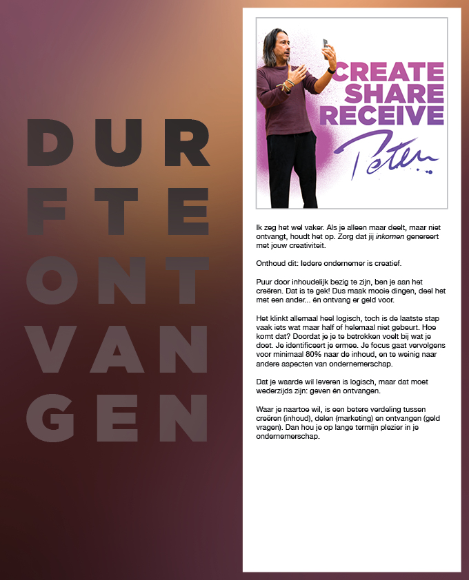 De laatste jaren richt hij zich bijna volledig op zijn paradepaardje: de ART-repreneur Academy. Speciaal voor creatieve ondernemers die ook succesvol willen worden. Peter: “Het is nu tijd al mijn kennis en ervaring terug te laten vloeien naar deze kwetsbare doelgroep.”